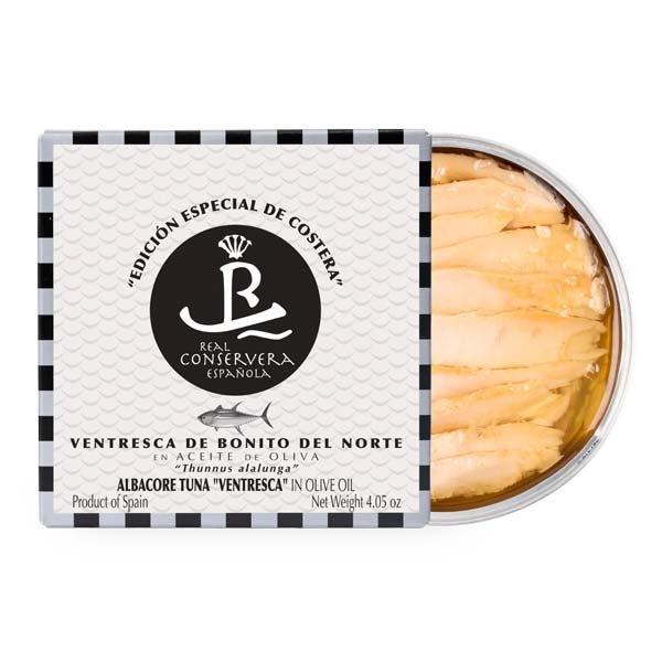 Esta ventresca gourmet se captura en el mar Cantábrico durante la Costera, que es la época en la que los bonitos se acercan a las costas para alimentarse. Se seleccionan los ejemplares más frescos y exquisitos, y se cocinan con un equilibrio perfecto de sal y jugosidad.